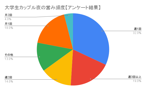 夜の営み頻度も一人暮らしかどうかで変わってきますが、過半数以上の大学生カップルは週一回以上行っていることが意外でした。