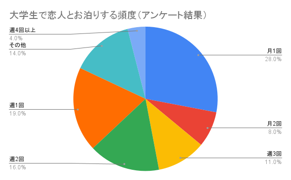 また、大学生なので一人暮らしをしている方も多く、一人暮らしをどちらかはしている場合はお泊りする頻度が増える傾向にあるようです。